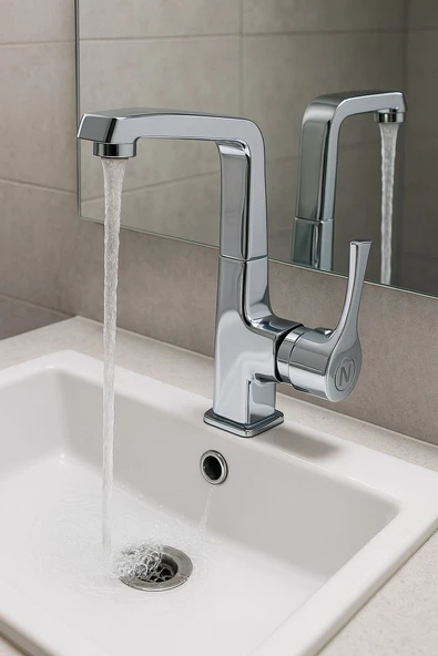 LAVABO BATARYASI KROM ŞELALE KARE GÖVDE EĞİMLİ HAVZA BANYO ARMATÜR ÇİFT GİRİŞ LÜKS ERGONAMİK