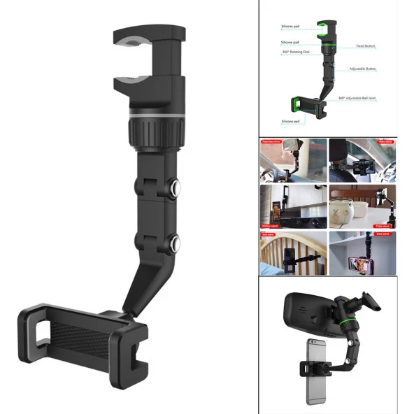 Araç İçi Telefon Tutucu Dikiz Aynası Uyumlu Çok Fonksiyonel 360 Ayarlanabilir Başlık