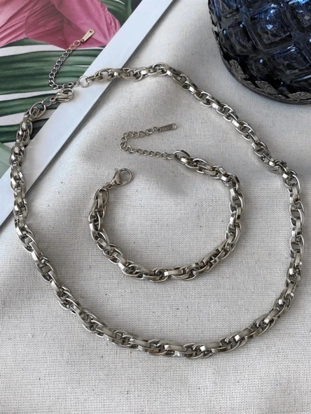 Gümüş Renk Çelik İç İçe Geçmeli Halat Unisex Kararmaz Kolye Ve Bileklik Çelik Set - 3214