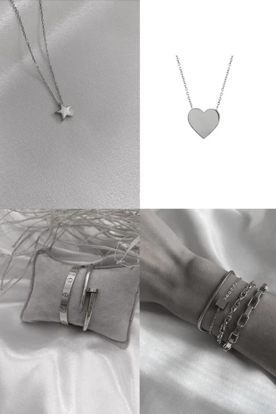 Gümüş Renk Kombin Kalp Kolye Yıldız Kolye Kartier Çivi Bileklik Ve Küp Kombin Bileklik - 2277
