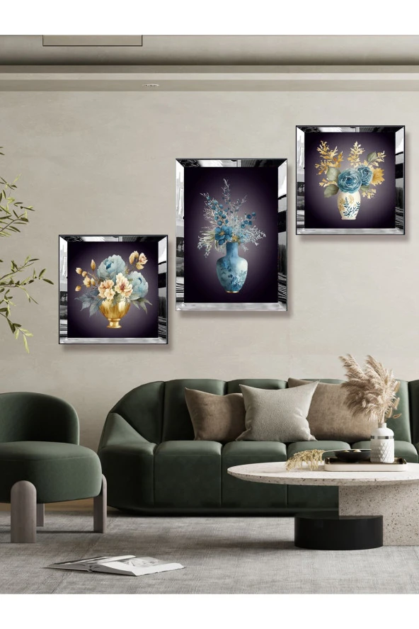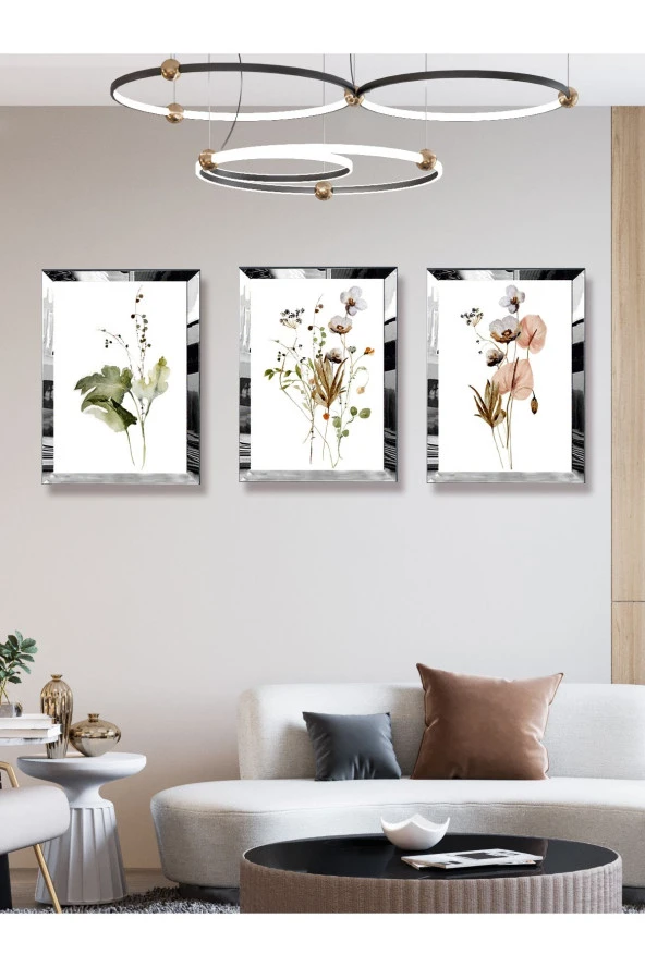 YALOVA SHOP Dekoratif Suluboya Çalışması 3 lü Tablo Seti (Gümüş Ayna Pleksi Çerçeveli)