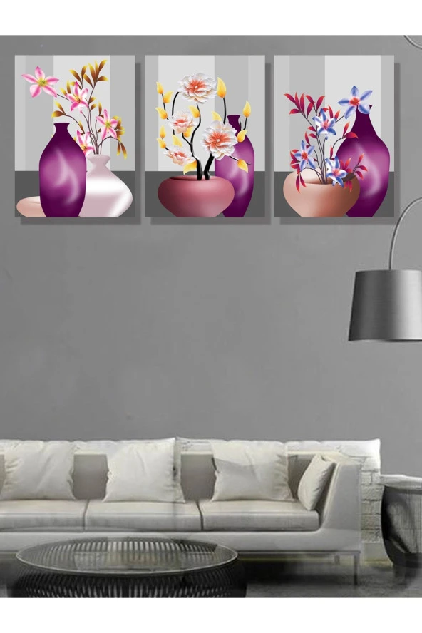 HYL Mor Renginin Çiçeklerle Düellosu,dekoratif 3'lü Tablo Seti