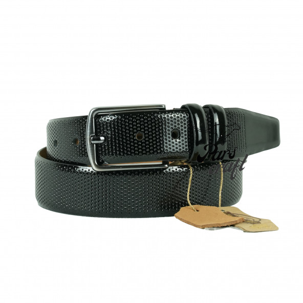 Parscraft Hakiki Deri Erkek Kemer 3,5 Cm Siyah İğne Baskılı Klasik Kumaş Pantolon Kemeri