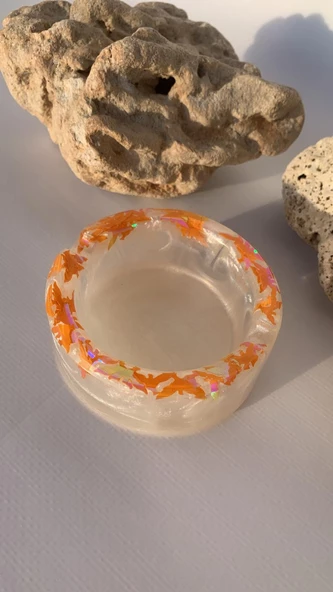 - Sedefli Beyaz Renk Epoksi İçinde Turuncu Kuş Süslemeli Yuvarlak Şekilli Küllük El Yapımı Hediyelik