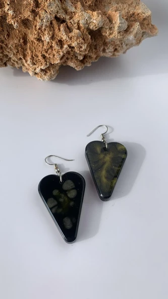 • Siyah Sarı Ebruli Renk Kalp Şekil Gümüş Aksesuarlı Epoksi Küpe El Yapımı Hediyelik