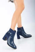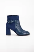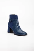 Ana Sayfa Giyim & Aksesuar Kadın Kadın Ayakkabı Bot Topuklu Bot Süet ve Kroko Deri Küçük Kemerli Lacivert Kadın Kalın Topuklu Bot